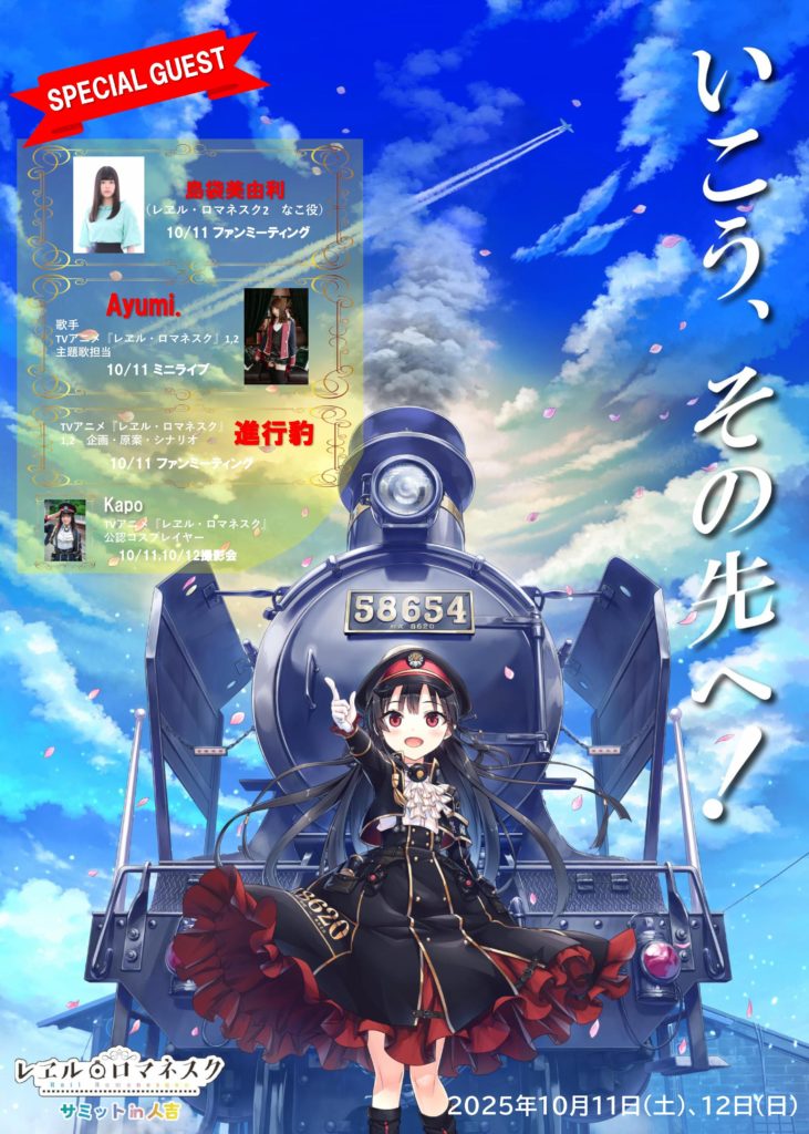 サミット2025 2025.08.022025.10.07 今年も開催!レヱル・ロマネスクサミットin人吉2025 2024年に続き、今年もクラウドファンディングのリターンとして開催する「レヱル・ロマネスクサミットin人吉2025」。2020年の「令和2年7月豪雨」以降、皆様のご厚情に支えられ、ここまで来ることができました。そしていよいよ、くま川鉄道全線再開が視野に入ってきた今年は、くま鉄の両方の起点である「人吉」と「湯前」を結び、さまざまなアクティビティをご用意。参加者様の思い出に残る2日間になるよう、準備を進めております。TVアニメ『レヱル・ロマネスク2』なこ役の島袋美由利さん、『レヱル・ロマネスク』1,2で主題歌を歌われたAyumi.さん、企画・原案・シナリオの進行豹先生、そして、『レヱル・ロマネスク』公認コスプレイヤーのKapoさんと、豪華ゲストの皆様をお迎えし、盛り上げてまいりたいと思います。クラウドファンディングご参加の皆様と一般参加の皆様、多くの方のご参加をお待ち申し上げております。 サミット2025ゲストの皆様 島袋美由利さん Ayumi.さん 進行豹先生 Kapoさん 両日スケジュールは下のボタンをクリック! クラウドファンディングリターン参加者様専用アンケート 2024年クラウドファンディングのリターンによる参加権をお持ちの方で、サミット2025に参加予定の方は、必ずご回答ください。 アンケートフォームへ 「聖地応援!サミット参加プラン」、「聖地滞在!特別列車乗車プラン」、「聖地満喫!宿泊プラン」をご支援いただいた皆様に、サミット参加権がございます。 重要:複数プランご支援いただいた方でも、「サミット参加権」は、1名様(1アカウント)につき1席でございます。権利の譲渡はできません。 【重要】サミット2025参加の方へのお知らせ サミット参加者様への重要なお知らせを更新しました。こちらからご確認いただけます。
